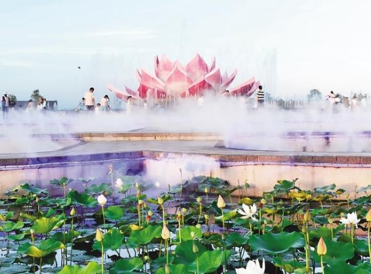 7月3日傍晚,淮陽(yáng)龍湖荷花苑里,前來(lái)乘涼的市民絡(luò)繹不絕。在一朵粉紅色的荷花造型景觀周圍,噴泉映光影、水霧繞碧荷,如夢(mèng)如幻,宛如仙境。