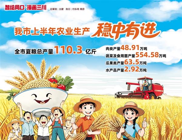 2025年上半年,我市農(nóng)業(yè)生產(chǎn)穩(wěn)中有進(jìn)。全市夏糧總產(chǎn)量110.3 億斤,同比增長(zhǎng)0.01%,980.1萬(wàn)畝秋糧長(zhǎng)勢(shì)良好,豐收豐產(chǎn)基礎(chǔ)扎實(shí);肉類產(chǎn)量48.91萬(wàn)噸,同比增長(zhǎng)3.19%;蔬菜及食用菌產(chǎn)量554.58萬(wàn)噸,同比增長(zhǎng)3.28%;瓜果類產(chǎn)量63.5萬(wàn)噸,同比增長(zhǎng)3.73%; 水產(chǎn)品產(chǎn)量2.92萬(wàn)噸,同比增長(zhǎng)4.2%。記者 付永奇 周彥 文/圖