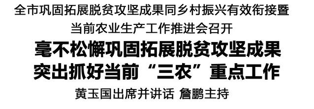 本報訊(記者 王艷) 11月10日,全市鞏固拓展脫貧攻堅(jiān)成果同鄉(xiāng)村振興有效銜接暨當(dāng)前農(nóng)業(yè)生產(chǎn)工作推進(jìn)會召開,對鞏固拓展脫貧攻堅(jiān)成果、抓好當(dāng)前農(nóng)業(yè)生產(chǎn)工作進(jìn)行再動員再部署。市委書記黃玉國出席并講話。市長詹鵬主持。