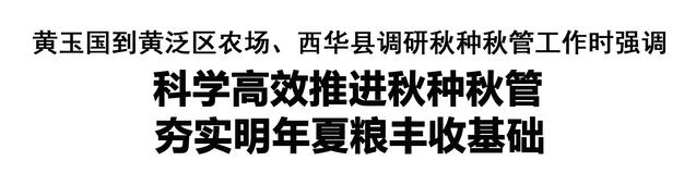 本報(bào)訊 (記者 王艷) 11月11日,市委書記黃玉國到黃泛區(qū)農(nóng)場、西華縣調(diào)研秋種秋管工作。他強(qiáng)調(diào),要深入學(xué)習(xí)貫徹習(xí)近平總書記關(guān)于“三農(nóng)”工作的重要論述和在河南考察時(shí)重要講話精神,堅(jiān)決扛穩(wěn)扛牢糧食安全責(zé)任,科學(xué)高效推進(jìn)秋種和田間管理,確保種足種好小麥,為明年夏糧豐收奠定堅(jiān)實(shí)基礎(chǔ)。