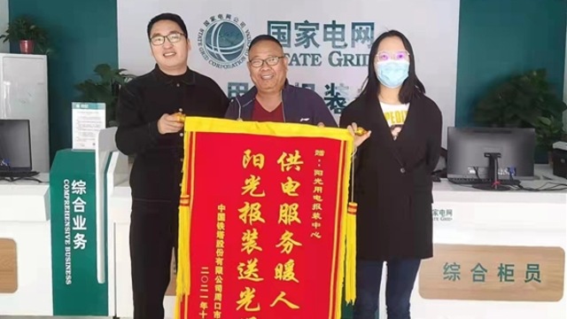 近日,在國網周口供電公司陽光報裝中心,中國鐵塔股份有限公司周口分公司業(yè)務經理朱義嶺一邊將印有“供電服務暖人心 陽光報裝送光明”的錦旗遞給供電工作人員,一邊感謝該公司對鐵塔基站建設提供的支持。