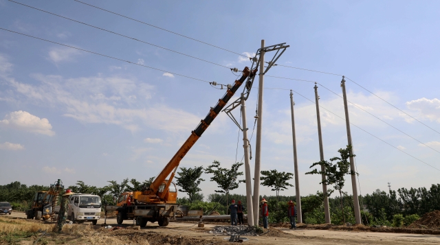 6月13日11時(shí),天氣格外晴朗,烈日下氣溫突破38攝氏度。西華縣黃橋鄉(xiāng)潁河河堤上一片忙碌的景象,該縣供電公司搶修人員正在烈日下緊張有序地忙活著。