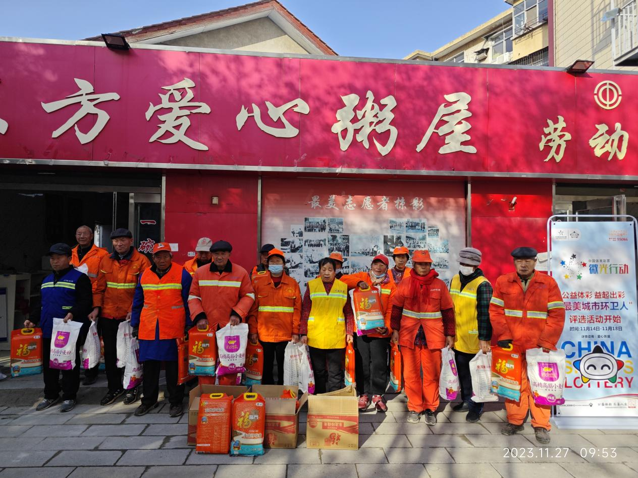 11月27日,周口體彩分中心工作人員攜帶米、面等物資來到“東方愛心粥屋”開展“公益體彩 益起出彩”致敬“城市最美環(huán)衛(wèi)人”活動公益活動,對20名“城市最美環(huán)衛(wèi)人”開展捐助。