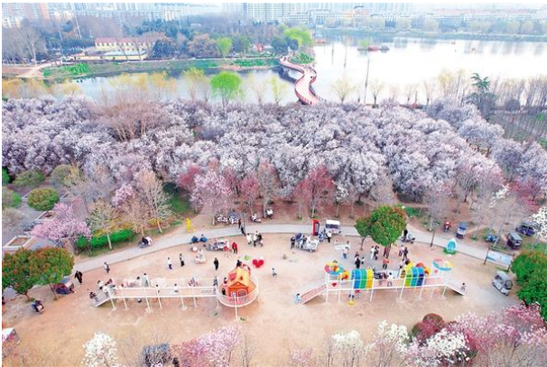 3月16日,項(xiàng)城市人民公園樹木蔥郁、色彩斑斕,綠植、觀景步道、湖水、民居相映成景,宛如一幅多彩的春日生態(tài)畫卷。