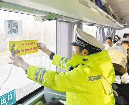 2月2日,周口交警為客車貼上溫馨提示條。2026年春運大幕正式拉開,為期40天的春運安保工作同步全面啟動。