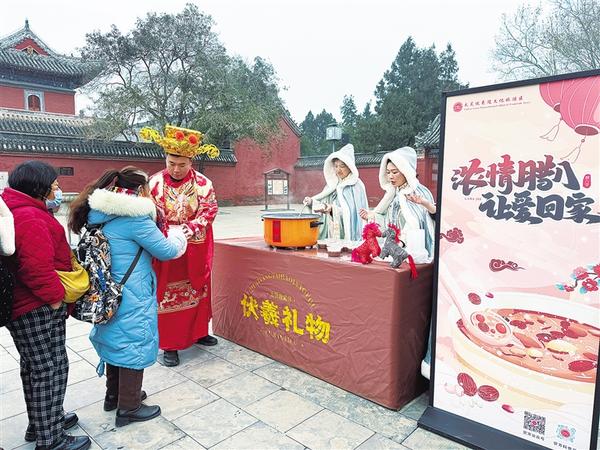 1月26日,游客排隊領取臘八粥。當日,農歷臘月初八,一場以“財神賜?!げ排钪唷す灿槿稹睘橹黝}的活動在太昊陵景區(qū)太極門廣場精彩上演,為游客們帶來了一場沉浸式文化盛宴。