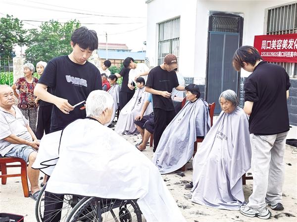 “我還是頭一次享受理發(fā)師上門服務(wù),太高興了。”6月30日下午,沈丘縣卞路口鄉(xiāng)張保元村村民馬桂榮撫摸著剛剪過的頭發(fā),臉上樂開了花。當(dāng)日,張保元村駐村第一書記劉會見組織周口科技職業(yè)高中的劉宇、李杰等7名志愿者來到張保元村開展義剪活動。