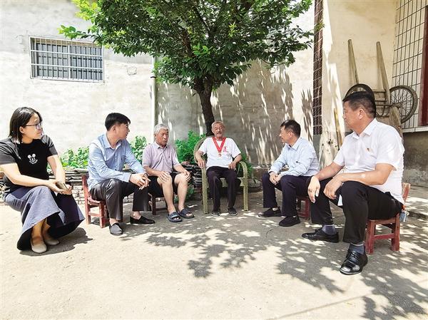 7月1日,沈丘縣付井鎮(zhèn)老黨員楊井明(右三)佩戴“光榮在黨50年”紀念章,為前來看望他的鎮(zhèn)村黨員干部講黨史。據(jù)了解,1968年7月1日,楊井明正式成為一名中國共產(chǎn)黨黨員。