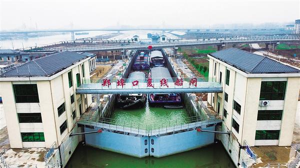 鄭埠口樞紐工程是沙潁河周口段關鍵性航運樞紐工程。近年來,通過航道疏浚、船閘擴建等升級改造工程,鄭埠口樞紐通航能力顯著提升,為周口從“黃土經(jīng)濟”向“藍海經(jīng)濟”轉(zhuǎn)型提供了有力支撐。圖為從周口港出發(fā)的貨船等待通過鄭埠口復線船閘。