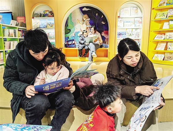 昨日, 市民帶著孩子在市新華書店內讀書。孩子們或聚精會神地看書,或認真聽家長講故事,在書香的陪伴下度過了有意義的一天。