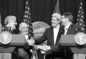 3月23日,在美國戴維營(yíng),阿富汗首席執(zhí)行官阿卜杜拉·阿卜杜拉、阿富汗總統(tǒng)阿什拉夫·加尼、美國國務(wù)卿克里和美國國防部長(zhǎng)卡特(從左至右)出席新聞發(fā)布會(huì)。