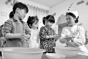 4月7日,醫(yī)務(wù)人員在為河北成安縣七色光幼兒園的小朋友講解正確的洗手方式。當日是世界衛(wèi)生日,河北省成安縣人民醫(yī)院組織醫(yī)務(wù)人員來到轄區(qū)幼兒園,為小朋友們講解如何正確洗手、刷牙等衛(wèi)生知識,讓他們認識到講衛(wèi)生的重要性,養(yǎng)成良好的衛(wèi)生習慣。新華社發(fā)