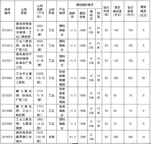 備注:1.2013013、2013014、2013017、2013022、2013037、2013038、2013039宗地位于產(chǎn)業(yè)集聚區(qū)內(nèi),屬兩層以上標(biāo)準(zhǔn)化廠房建設(shè)用地,投資強(qiáng)度≥3750萬元/公頃。地上有部分違法建筑物,經(jīng)政府辦、發(fā)改委、財(cái)政局、監(jiān)察局、法制辦、住建局、審計(jì)局、房產(chǎn)辦、規(guī)劃辦、城市綜合執(zhí)法局和縣產(chǎn)業(yè)集聚區(qū)管委會(huì)集體研究,地上建筑不再作價(jià)與土地捆綁出讓,由土地競(jìng)得人無償處置地上建筑物。土地出讓合同簽訂后,8個(gè)月內(nèi)必須開工建設(shè),工期24個(gè)月,土地成交價(jià)款需在土地出讓合同簽訂后60日內(nèi)繳清,交地時(shí)間在3個(gè)月內(nèi)。