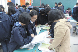 該校將課堂名字定為“求真大課堂”,以“真”字作為學校一切教育教學和管理的衡量標準。朱貴華說,求真就是要真教、真學、真嚴、真愛、真實、真會。為提高課堂教學效果,該??偨Y(jié)出一套獨特的課堂教學方法——“七音和鳴”。分管教學工作的副校長徐其運用“1234567”,即哆來咪發(fā)唆拉西”來詮釋“七音和鳴”法?!?”就是一個學習目標;“2”就是提前兩分鐘進班,布置2個任務(wù)(出示目標、檢查學情);“3”就是準備3個本子,即學情檢效本、跟蹤本、糾錯本;“4”是4個維度考評,即高速度、準確度、干凈度、參與度;“5”是5個跟蹤,即節(jié)跟蹤、日跟蹤、周跟蹤、月跟蹤、學期跟蹤,堅持“抓緊跟蹤不放松、我在文昌必成功”的教育信念;“6”是6個環(huán)節(jié),即激情導(dǎo)入、自研自探、合作探究、展示質(zhì)疑、師生點評、當堂檢測;“7”是7個評價,即教師的教案、學生的學案、練案、觀課記錄的每周業(yè)務(wù)評價及對學生的即時性、激勵性、長效性評價。
