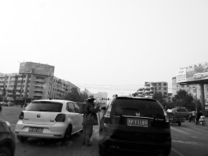 圖① 市區(qū)多個路口都存在攔車行乞現(xiàn)象,既不文明又不安全。