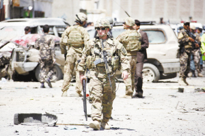 阿富汗喀布爾機場附近發(fā)生爆炸      5月17日,士兵在阿富汗首都喀布爾發(fā)生爆炸的現(xiàn)場查看。阿富汗首都喀布爾機場附近17日發(fā)生一起自殺式爆炸襲擊,造成至少3人死亡、18人受傷。 新華社發(fā)
