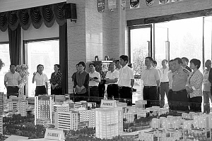 羅文閣在商務(wù)中心區(qū)規(guī)劃沙盤前聽取項目進展情況匯報。丁宇濤 攝
