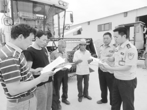昨日,商水縣舒莊鄉(xiāng)派出所民警正在杜店村遠(yuǎn)豐農(nóng)機專業(yè)合作社向農(nóng)機手宣傳“三夏”生產(chǎn)安全知識。為確保“三夏”生產(chǎn)安全,舒莊鄉(xiāng)派出所印發(fā)2000份《三夏安全生產(chǎn)知識宣傳單》,組織民警深入田間地頭和農(nóng)家小院向農(nóng)機手們面對面進(jìn)行安全生產(chǎn)宣傳。(喬連軍 攝)