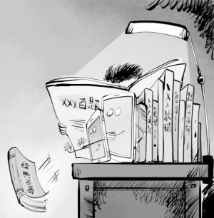 記者調(diào)查發(fā)現(xiàn),在繁重的課業(yè)負(fù)擔(dān)下,不少初高中學(xué)生所讀書(shū)籍越來(lái)越單一,教輔書(shū)占了絕大比例。智能手機(jī)的普及,各類(lèi)社交平臺(tái)的出現(xiàn),更是讓學(xué)生沉溺于淺閱讀。相反,拿起名著、對(duì)話經(jīng)典等深層次閱讀的情況,卻不容樂(lè)觀。這正是: