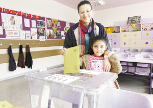 土耳其舉行議會選舉 6月7日,在土耳其首都安卡拉一個投票站,一個小女孩幫媽媽投票。土耳其議會選舉當(dāng)日開始投票。執(zhí)政的正義與發(fā)展黨、主要反對黨共和人民黨、民族行動黨和親庫爾德的人民民主黨在內(nèi)的20個政黨參加競選,角逐550個議會席位。新華社發(fā)