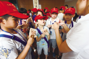 小記者們按照要求學(xué)起四指點(diǎn)鈔法,可手指怎么也不聽使喚。銀行的阿姨告訴他們竅門:先將一沓點(diǎn)鈔紙彎成扇形,然后每根手指撥動(dòng)一張點(diǎn)鈔紙。很快,小記者們就熟練了許多。