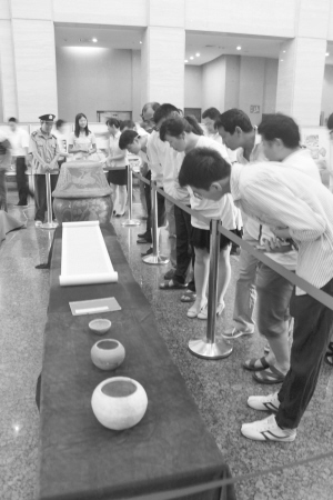 當日上午,聽說有3位市民要捐贈藏品,很多市民到市博物館一飽眼福。在市博物館大廳,很多市民圍著商瑩冰、馬偉、崔猛3位市民捐贈的藏品仔細觀看。
